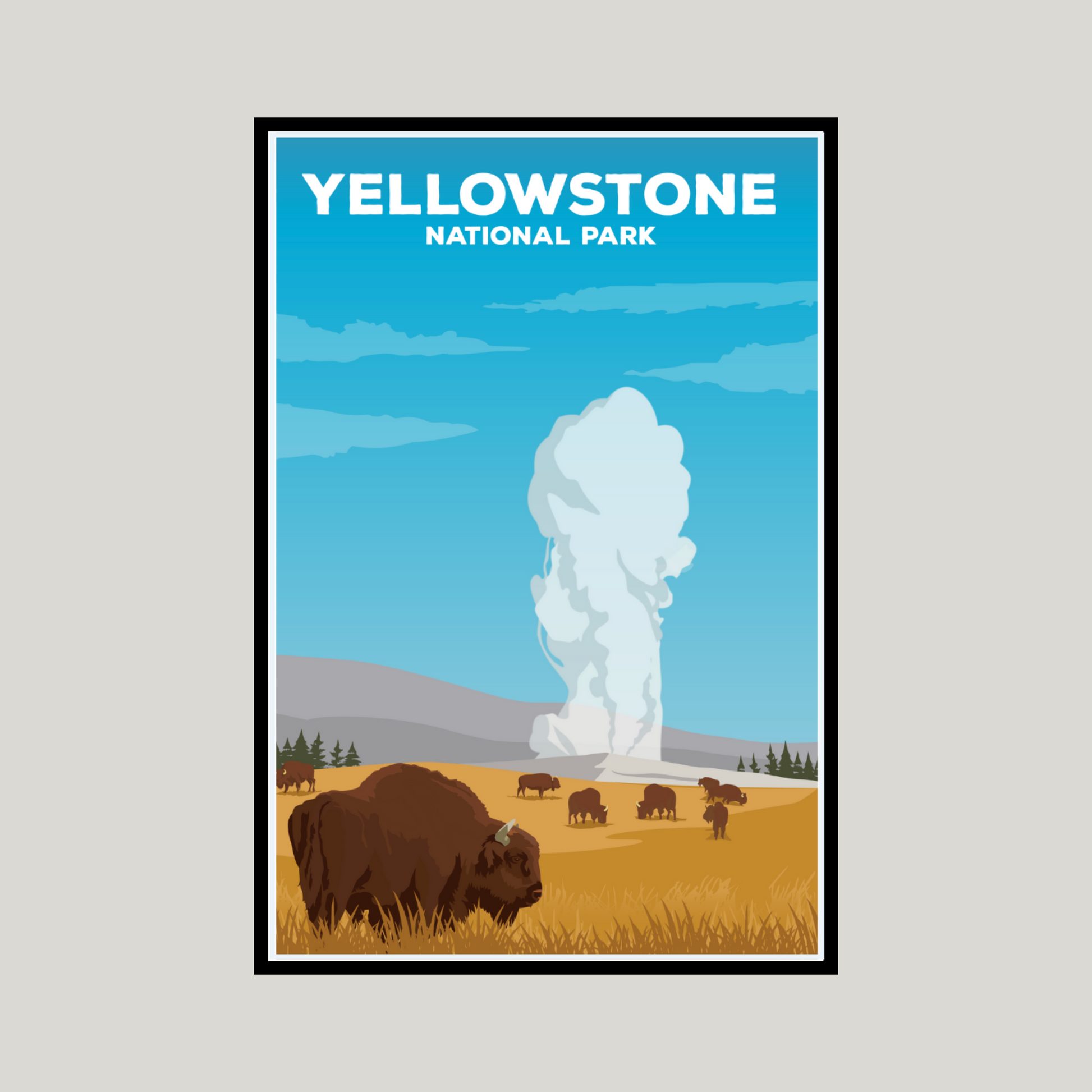 This year, I was able to spend a day and a half in Yellowstone - and it was incredible! We timed the Geysers perfectly and saw Old Faithful and the Grand Geyser erupt in spectacular form. Not to mention we were even able to see 2 wolves from the Wapiti Lake pack! This poster showcases the public land bison found at Yellowstone pictured in front of an erupting geyser!